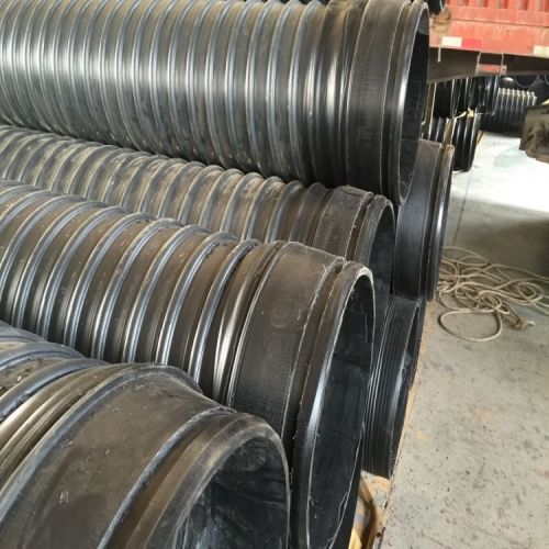 塑鋼纏繞管由鋼塑復合的異型帶材經(jīng)螺旋纏繞焊接(搭接面上擠出焊接)制成。成型的管材呈螺旋直肋結(jié)構(gòu),管壁外表面有等間距螺旋環(huán)繞的肋片加強。肋片是由普通碳素結(jié)構(gòu)鋼帶外包覆聚乙烯構(gòu)成,通過聚乙烯包覆使鋼帶與聚乙烯渾然一體。聚乙烯管壁構(gòu)成封閉的流體通道,加強鋼帶構(gòu)成了管材的環(huán)剛度。加強鋼帶的厚度與寬度根據(jù)管材直徑、環(huán)剛度要求不同而分別設(shè)計確定。
